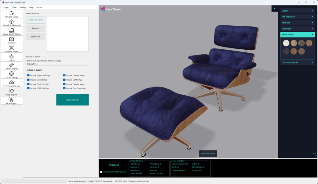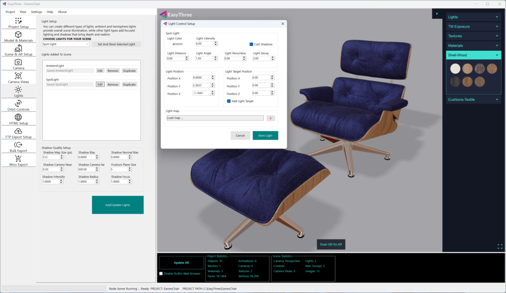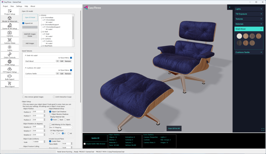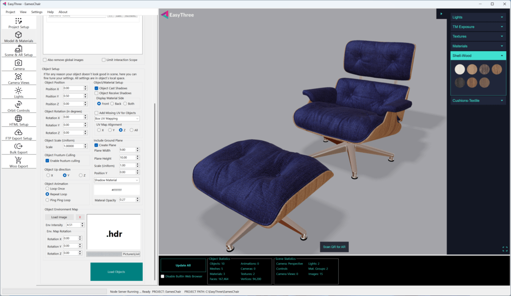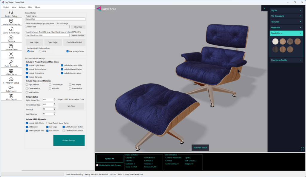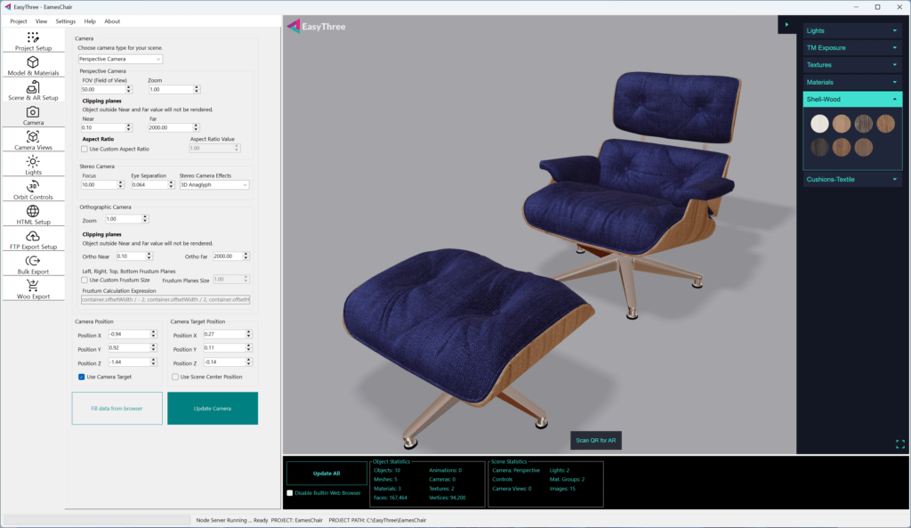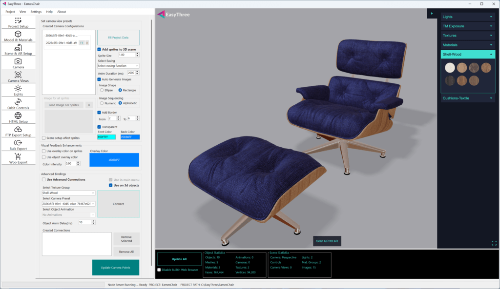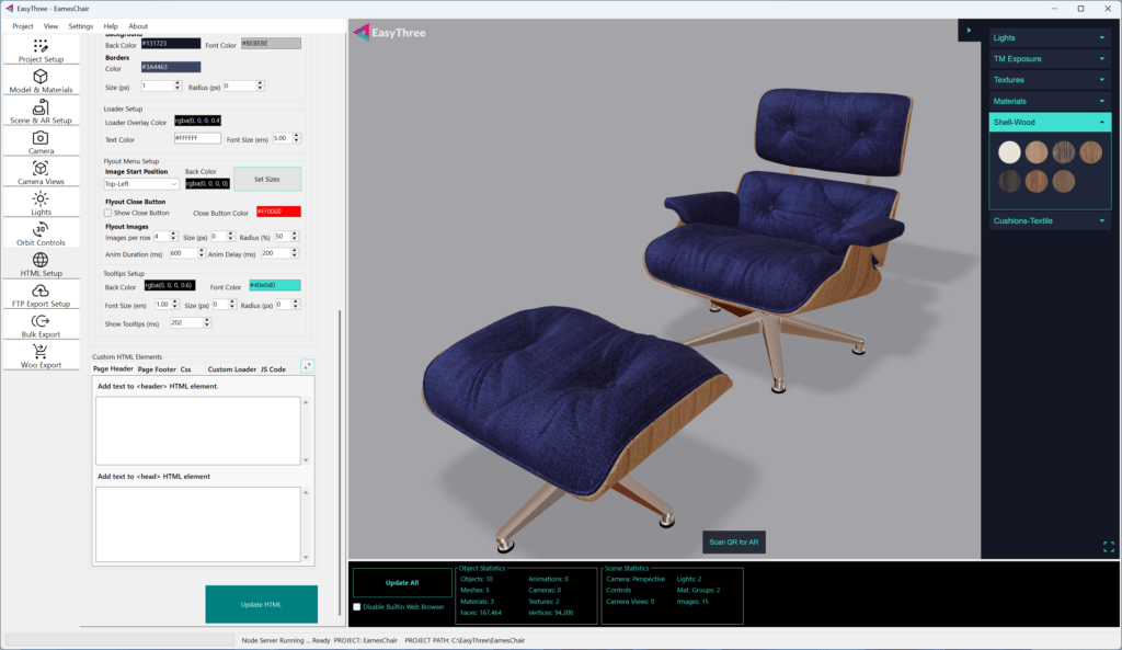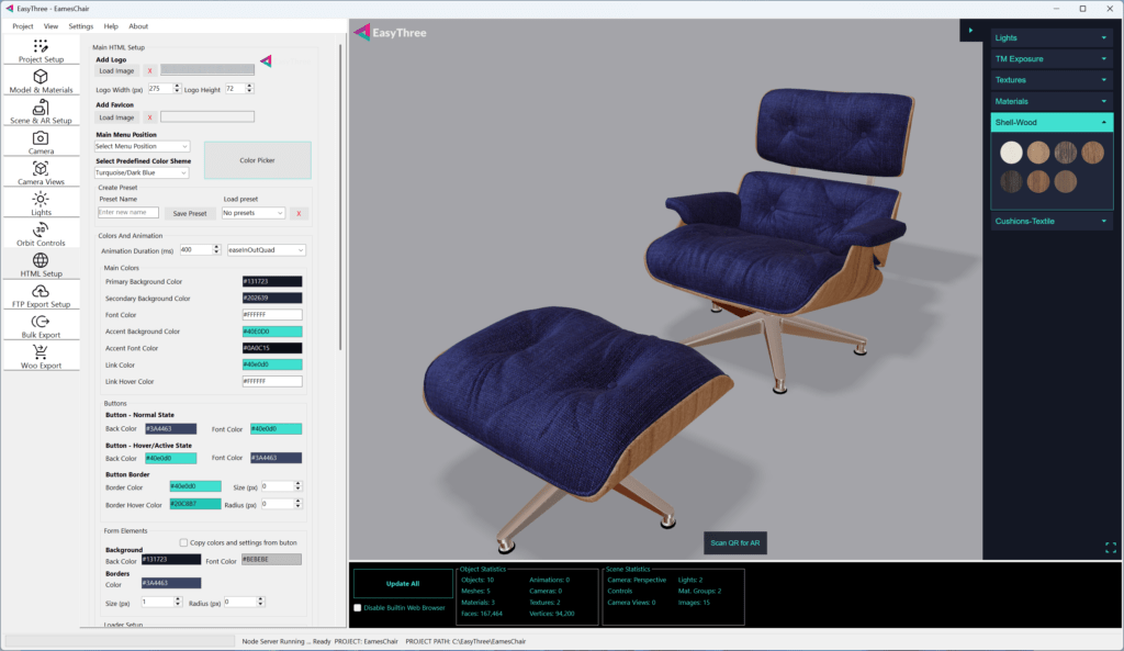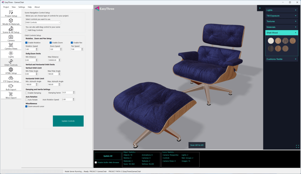 Set orbit controls, camera angles, lighting, and HTML layout, all inside EasyThree.